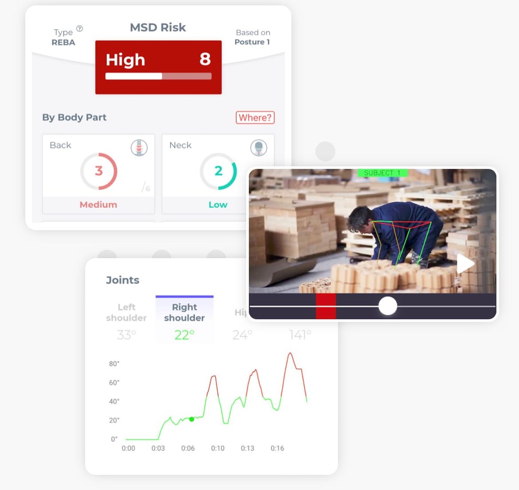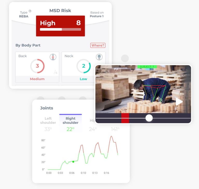 Solução inovadora com a tecnologia da inteligência artificial para avaliar cada movimento humano. Avaliamos os movimentos dos trabalhadores em tempo real, durante as suas atividades.