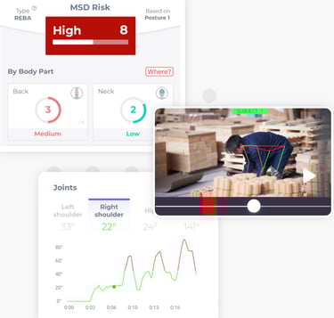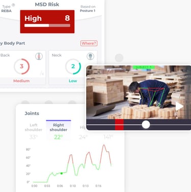Solução inovadora com a tecnologia da inteligência artificial para avaliar cada movimento humano. Avaliamos os movimentos dos trabalhadores em tempo real, durante as suas atividades.